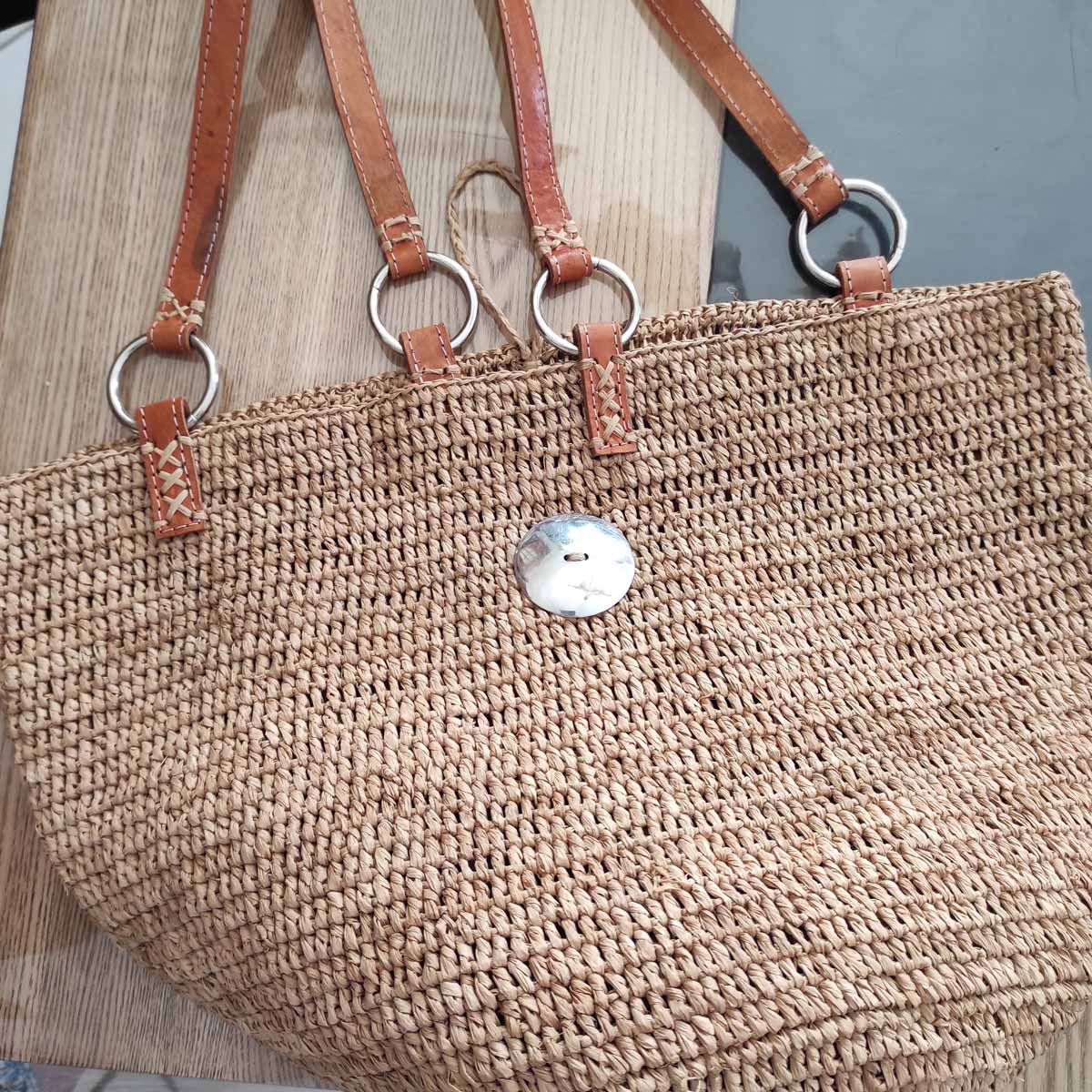 Ce sac en raphia se ferme à l’aide d’une cordelette venant entourer un bouton en aluminium.
